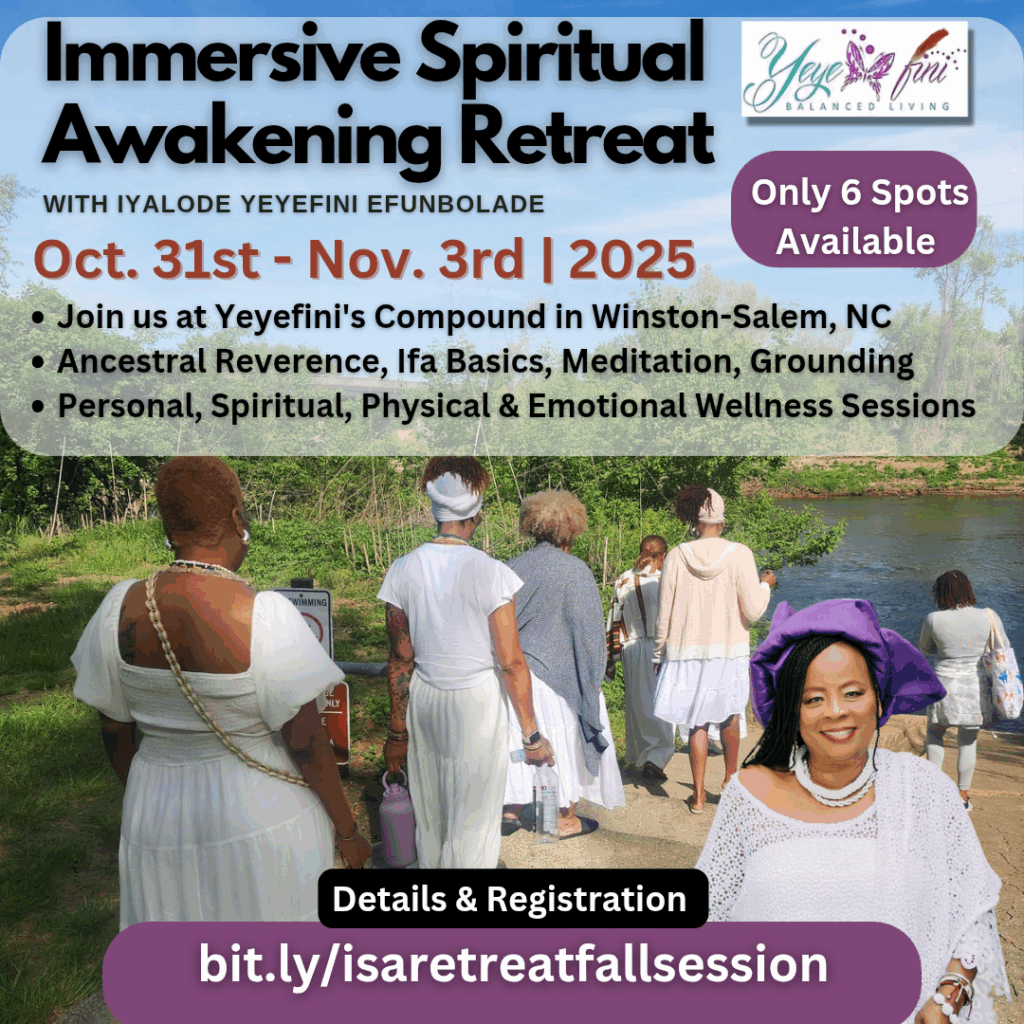 Step into a sacred space of healing, clarity, and transformation at the Immersive Spiritual Awakening Retreat – Fall Session, guided by the wisdom and presence of Iyalode Yeyefini and Priestess Oyabunmi. Over the course of four deeply intentional days in the tranquil beauty of Winston-Salem, NC, you will be nurtured in mind, body, and spirit. Through personalized spiritual counsel, daily rituals, sacred ancestral work, and holistic nourishment, you’ll shed energetic burdens and reconnect with your higher self.